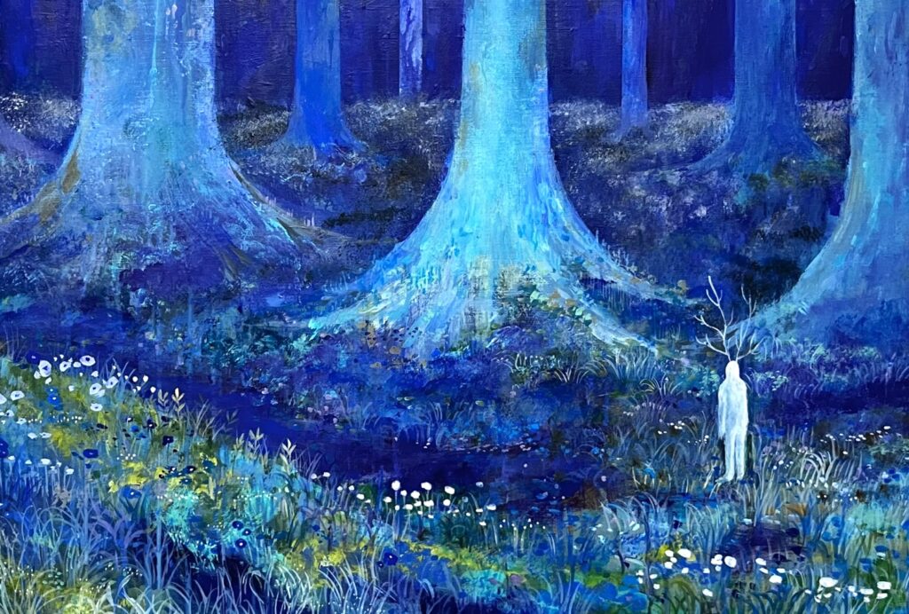加藤奈月さんは北海道札幌市出身・在住で、地元の森に分け入り、森と同化することでインスピレーションを得て制作を行っています。そこには自然やさらに自然を超えるものに対する畏怖が感じられます。彼女が素晴らしいのは、そうした思いを単なるイメージに終わらせず、自身の中で十分に咀嚼し独自の技術で表現として落とし込んでいるところです。アクリル絵の具を用いた彼女の色彩表現には独特の深さがあり、それが森の風景を神秘的で奥行きのあるものにしています。また、最近の作品では一歩踏み込んで画面に精霊そのものも登場させ、彼女が感じ取った幻想性をより直接的に伝えようとしています。
